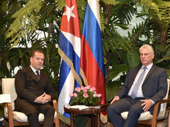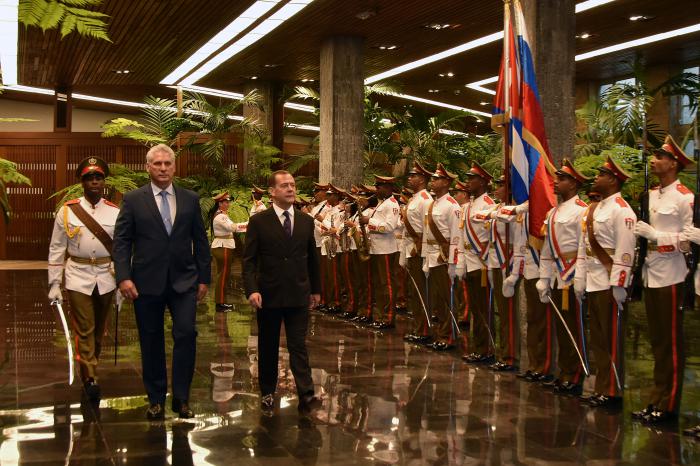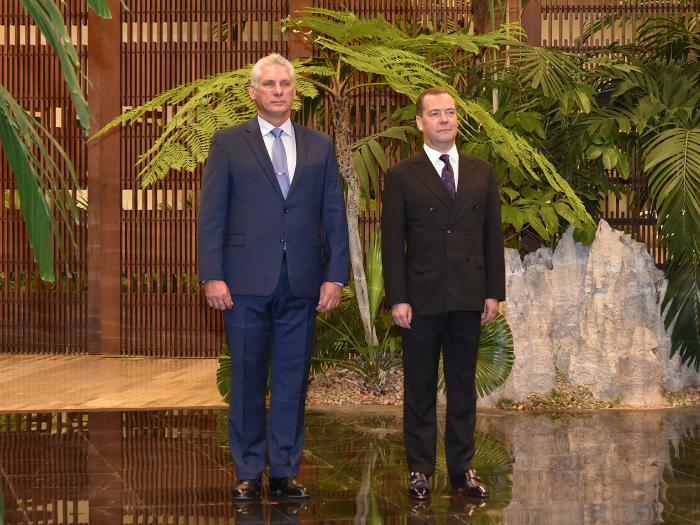 El Presidente de los Consejos de Estado y de Ministros, Miguel Díaz-Canel Bermúdez, recibió este jueves al presidente del Gobierno de la Federación de Rusia, excelentísimo señor Dimitri Anatolievich Medvedev, quien realiza una visita oficial a Cuba.