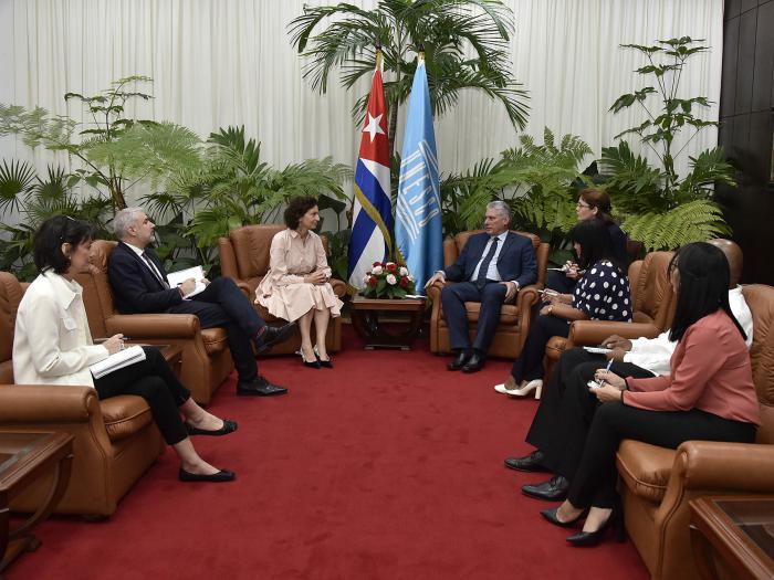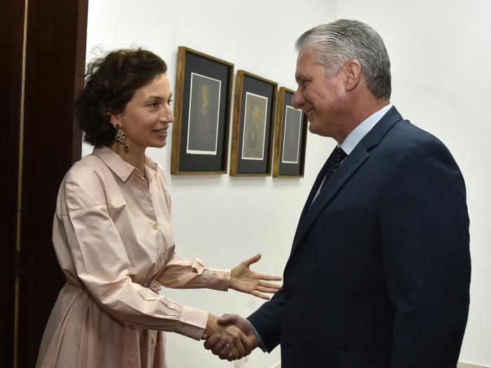 El Presidente de la República de Cuba, Miguel Díaz-Canel Bermúdez, recibió este viernes a la directora general de la Organización de Naciones Unidas para la Educación, la Ciencia y la Cultura (Unesco), señora Audrey Azoulay, quien realiza una visita oficial a nuestro país.