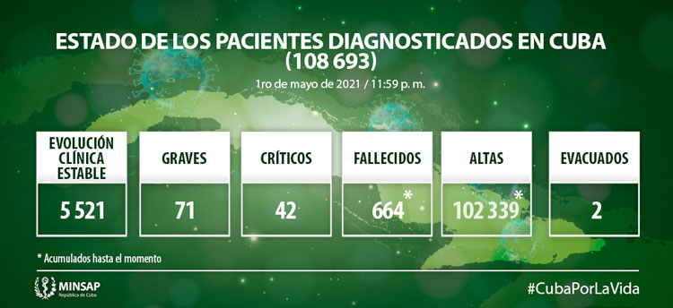 - Ciudadana cubana de 71 años de edad. Municipio Habana del Este. Provincia La Habana Antecedentes Patológicos Personales: Glaucoma. Se encuentra en Cuidados Intensivos, afebril, mejoría clínica, radiológica y gasométrica, extubada, en ventilación espontánea con distress respiratorio ligero, buena saturación. Hemodinámicamente estable. Diuresis conservada. PCR evolutivo negativo. Reportada de grave.