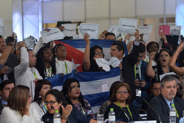Cuando la presidencia pidió sesionar en otro salón, a puertas cerradas, recibió el abucheo colectivo y el rechazo de quienes vinieron, como Cuba, a hacer propuestas, plantear preocupaciones sociales y a denunciar la corrupción política en la región.