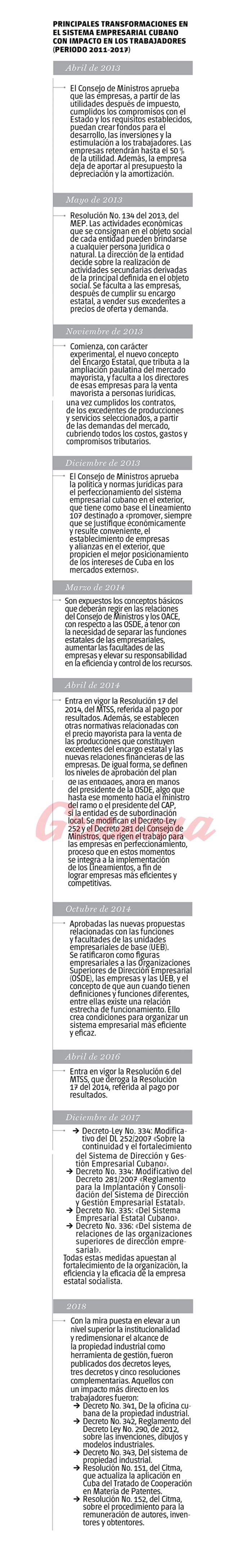 - En abril de 2011, el 6to. Congreso del Partido aprobó los Lineamientos 6, 7 y 15, los cuales orientaban que: El sistema empresarial se constituya por empresas eficientes, bien organizadas y eficaces; separar las funciones estatales de las empresariales e integrar el Perfeccionamiento Empresarial a las políticas del Modelo Económico.