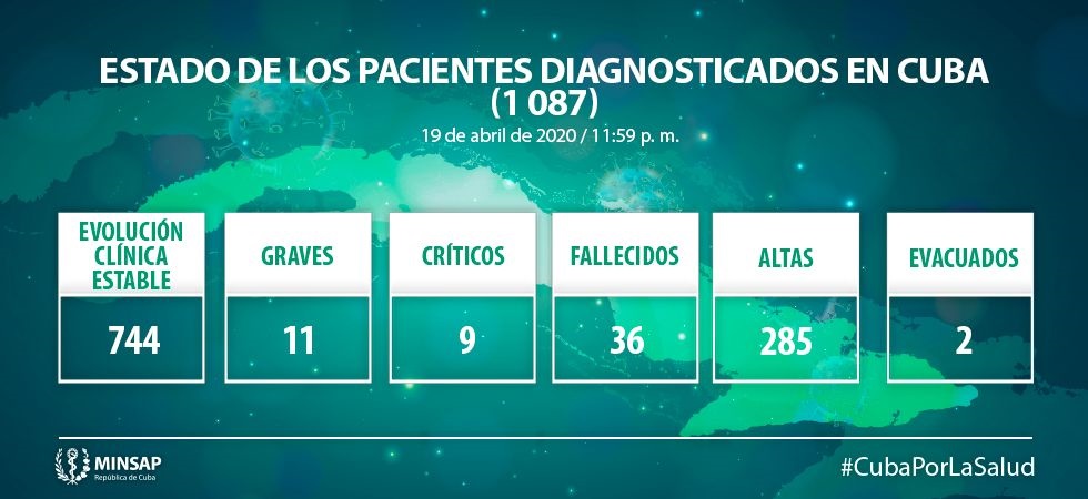 De los 1087 pacientes diagnosticados con la enfermedad, 744 presentan evolución clínica estable, se reportan 36 fallecidos (dos en el día), dos evacuados y 285 altas (30 más en el día de ayer). Se reportan nueve pacientes en estado crítico y 11 pacientes en estado grave.