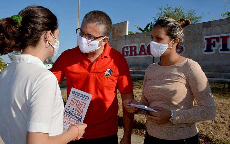 En la valla con la frase Gracias, Fidel, en la Carretera Central (banda Esperanza), representantes de las nuevas generaciones de villaclareños que en la línea roja y en otros sectores de la sociedad han tenido un alto protagonismo en la batalla contra la COVID-19, recibieron la condición Jóvenes por la Vida, entregada por Carlos Manuel Ruiz Cepero, presidente del Consejo de Defensa Municipal en Santa Clara, y por Alexis Pérez Batista, primer secretario de la UJC en Villa Clara.