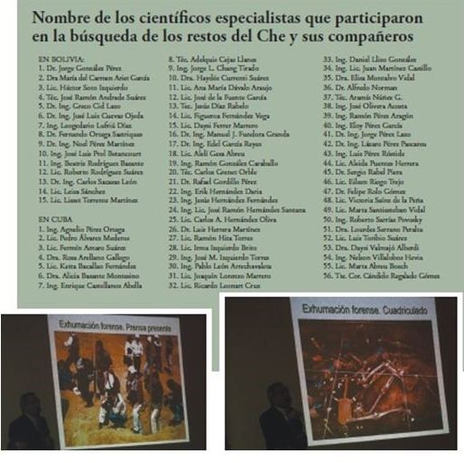 Debemos destacar que en esta labor de investigación, búsqueda, hallazgo e identificación de los restos del Che y sus compañeros de lucha participaron 71 científicos y especialistas cubanos, de los cuales 15 trabajaron, en diferentes momentos, en Bolivia, en incansable labor, ampliando y profundizando la investigación histórica, así como utilizando y aplicando con iniciativas diversos medios tecnológicos modernos y otros creados con ese fin.
